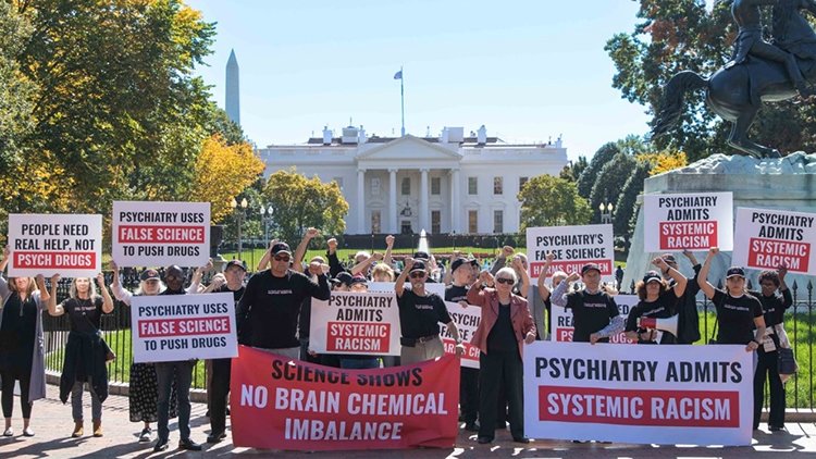 A CCHR önkéntesei az Amerikai Pszichiátriai Társaság (APA) Mentális Egészségügyi Szolgáltatások Konferenciája alatt Washington, DC belvárosában tüntettek a pszichiátria rendszerszintű rasszizmusa és a „kémiai egyensúlyhiány” elmélete ellen.